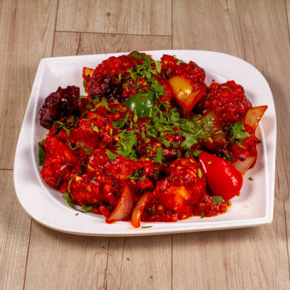 A bold and spicy South Indian favorite made with tender chicken pieces marinated in chili, garlic, and aromatic spices, then deep-fried until crispy. Tossed with curry leaves and flavorful seasoning, it delivers a fiery kick and irresistible crunch in every bite.