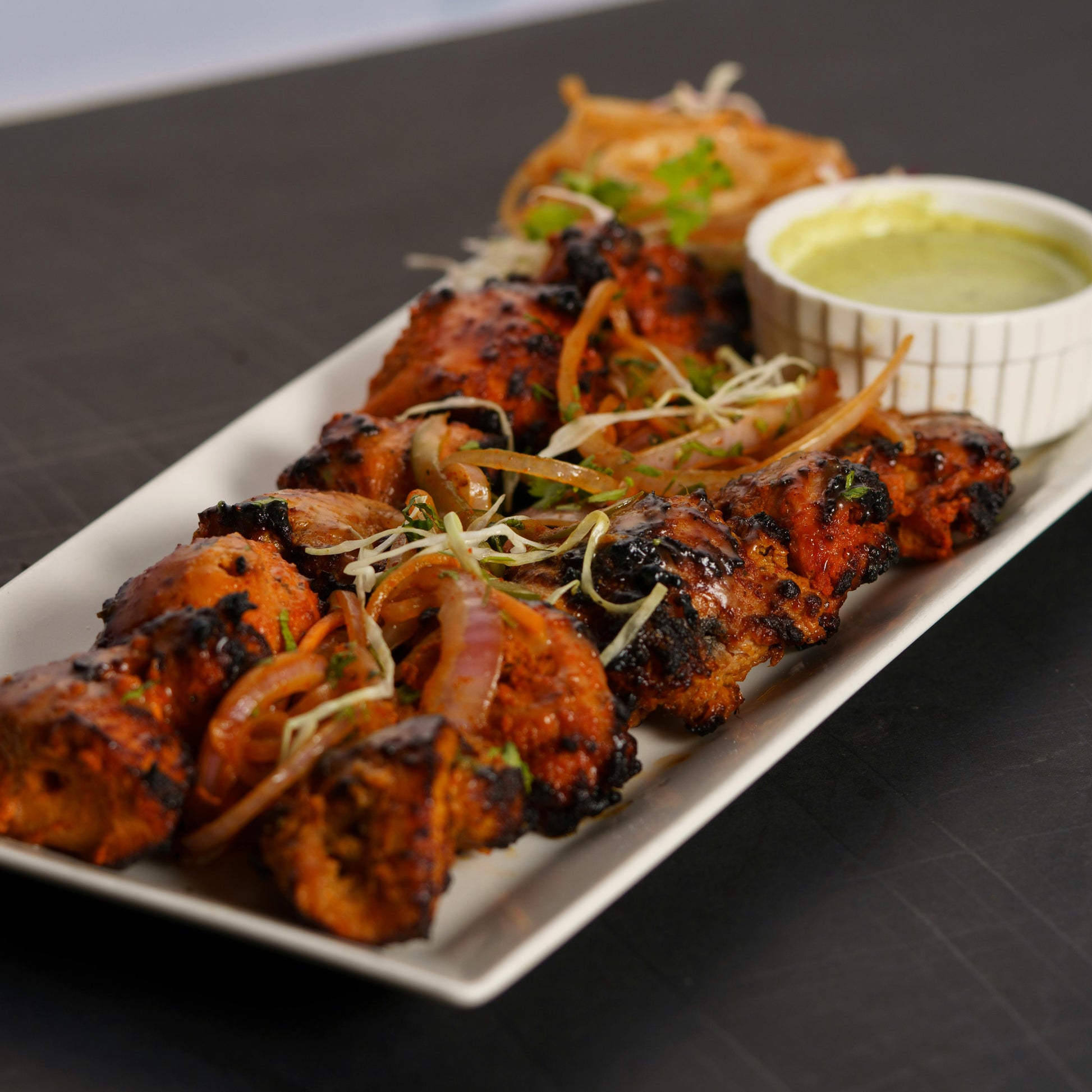 Juicy pieces of chicken marinated in yogurt, garlic, ginger, and aromatic spices, then grilled until perfectly charred and smoky. Tender, flavorful, and lightly spiced, this classic dish is perfect as an appetizer or served with naan and fresh chutney.
